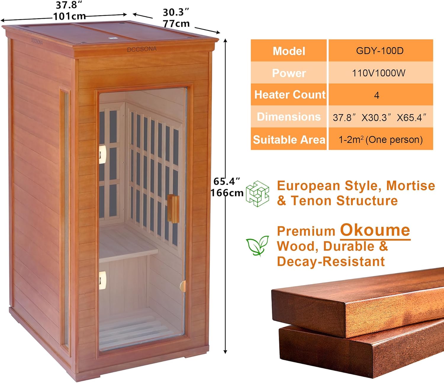 | Product Name | 1-Person Far Infrared Sauna with Red Light Therapy – Compact Okoume Wood Indoor Home Spa, 4 Fast Heating Panels (1000W 110V), Bluetooth, 7-Color LED & Timer – 65.4″ Tall (Fits Small Spaces) |