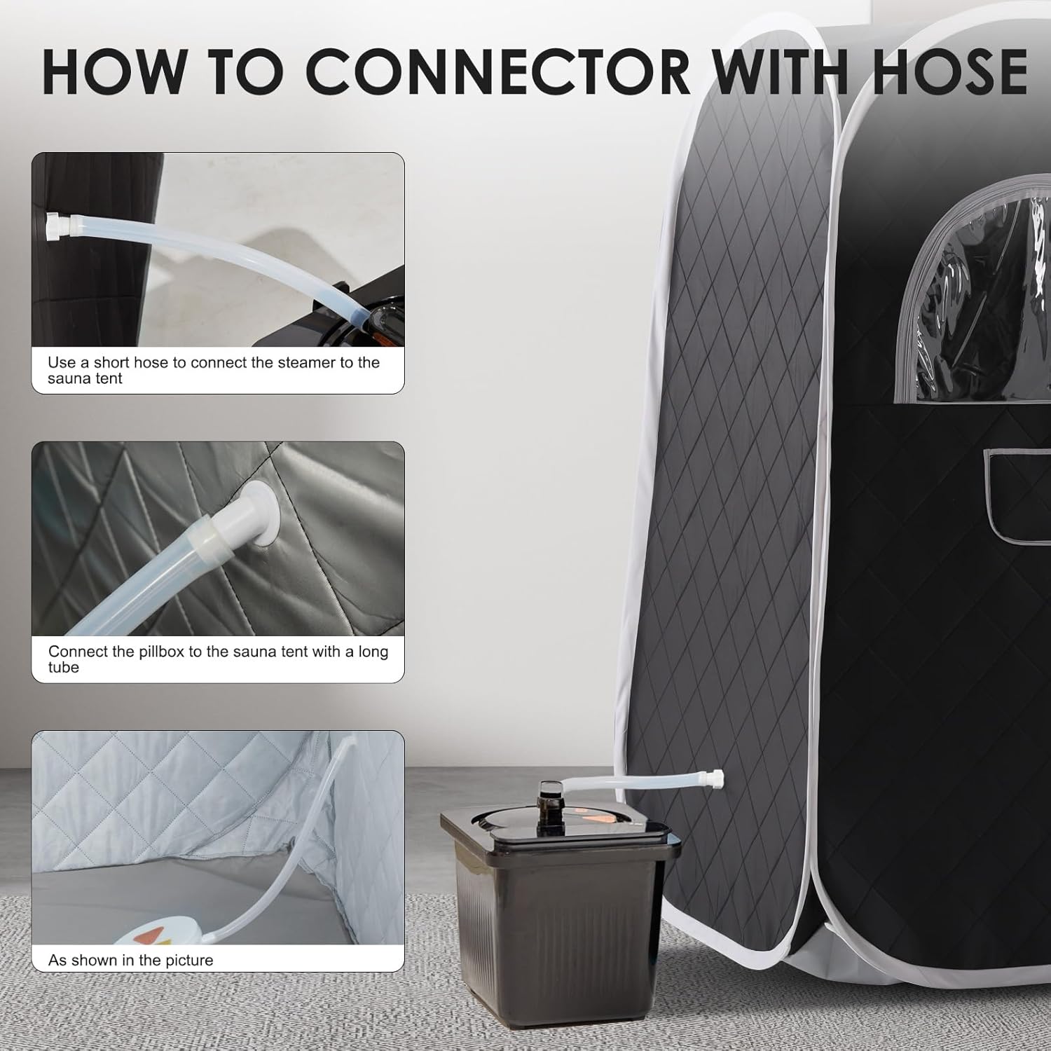 - Connect the steamer to the tent via the supplied hose, plug it in, and power it on.