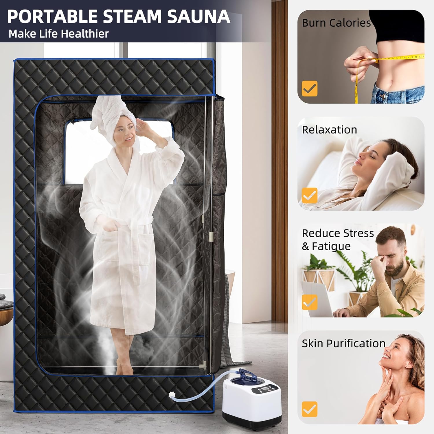| Product name | Portable Steam Sauna, Full Size Portable Sauna for Home, Sauna Tent Sauna Box with 3.0L Steamer, Remote Control, Folding Chair, 9 Levels |