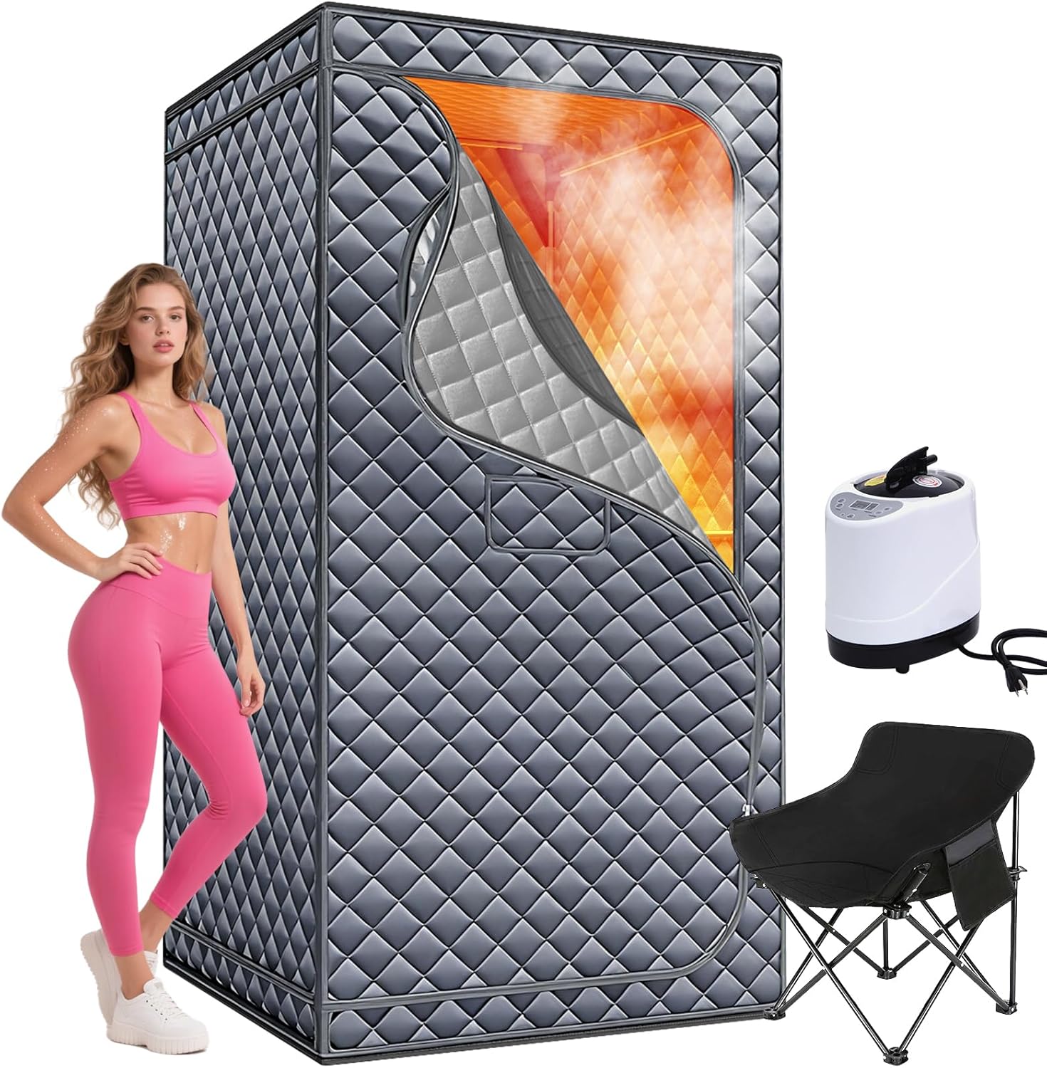 You unpack everything and realize the components are precisely what the product promised: tent cover, folding 304 stainless steel frame, an extra-large folding chair, the 3L 1300W steamer, a remote control, and small accessories like support rods and fixing buckles. The box does a fine job of separating parts so you don’t end up wrestling tangled fabric like someone trying to free a trapped bat.