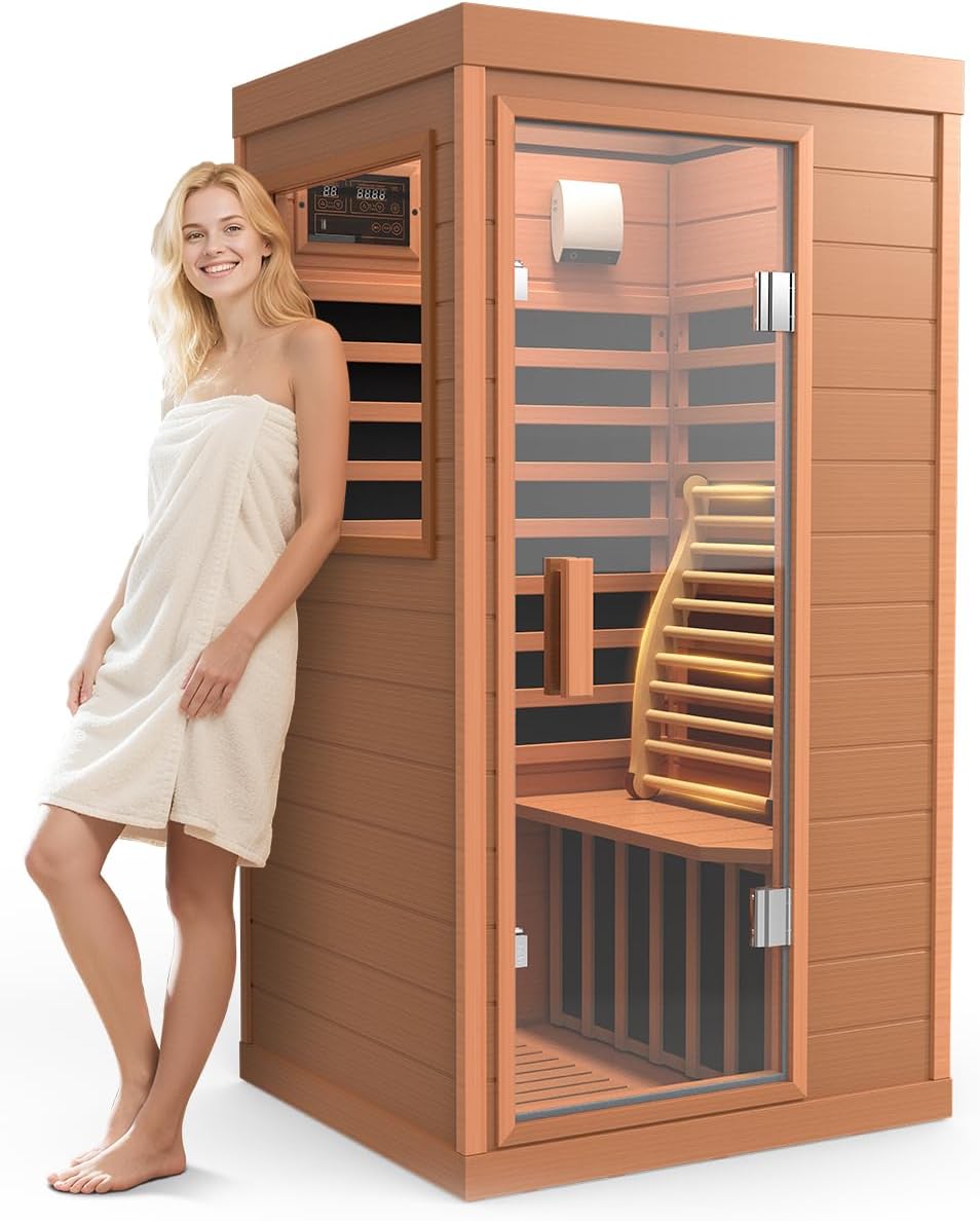 You’ll enjoy the Upgraded 1 Person Sauna Infrared Sauna with Backrest, Hemlock Dry Sauna Indoor Wood Sauna for Home, 1062W 110V Low EMF Far Infrared Sauna with Integrated Speakers, Reading Lamp (Red) if you appreciate craftsmanship, convenience, and a gentle, internal warmth. You’ll likely use it regularly if you value at-home wellness rituals and want an elegant, single-person solution that’s easy to install and pleasant to look at.